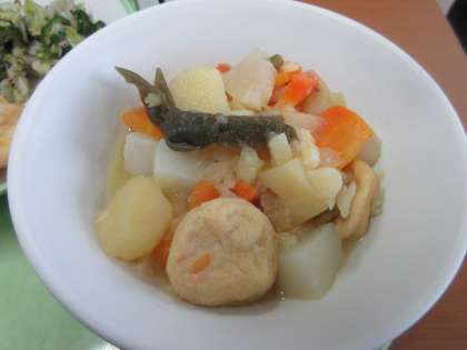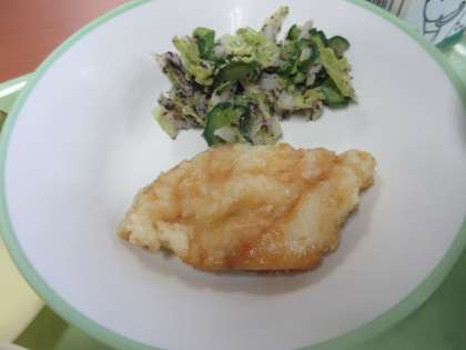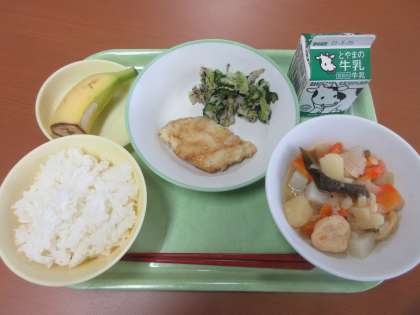 「スタミナ揚げ」ニンニクがきいていて、おいしい!! ごはん 牛乳 魚のスタミナ揚げ ゆかり和え 炊き合わせ バナナ