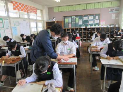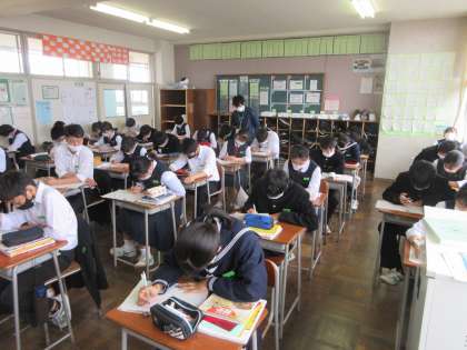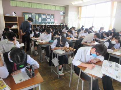 社会の授業です。 中間評価前に、復習プリントに取り組みました。