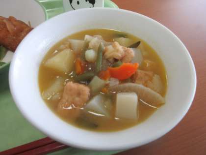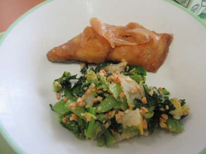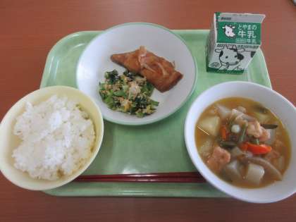 魚にタマネギのうまみがしみ込んでいます!! ごはん 牛乳 魚の南蛮づけ いり大豆和え 関東だき