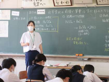理科の授業です。 化学変化の前後で質量は変化するのかどうかを学習しました。