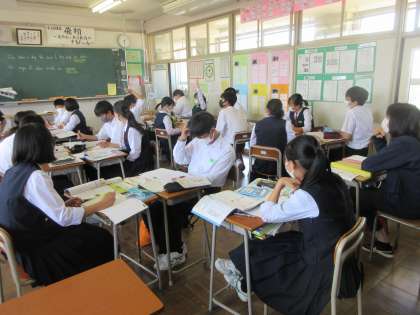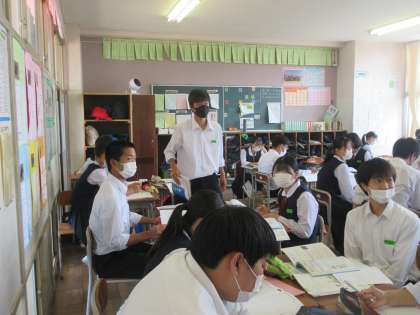 英語の授業です。 朝美が新しいALTのベイカー先生と会話している場面を学習しました。