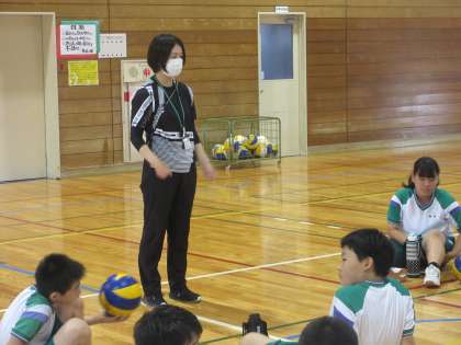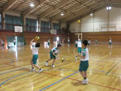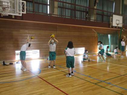 保健体育の授業です。 バレーボールで、オーバーハンドパスとアンダーハンドパスを練習しました。