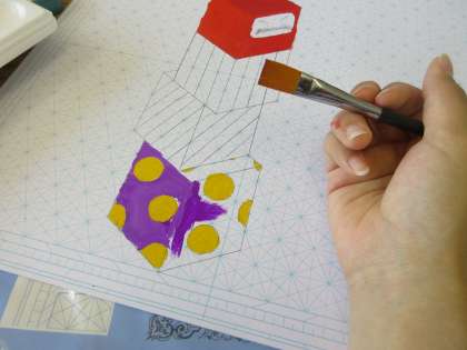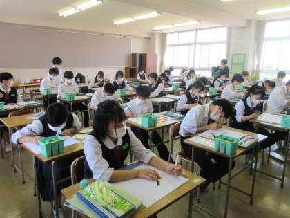 美術の授業です。 デザインボードを制作中です。 「よっ、色彩の魔術師!!」
