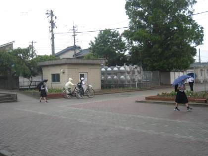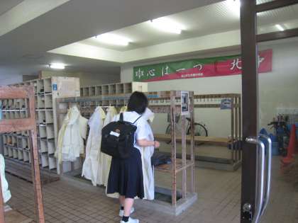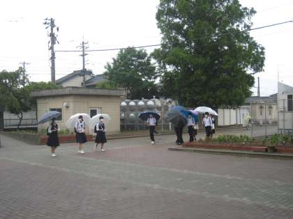 雨が降る中、元気に登校しました。 玄関に、雨具が並びました。