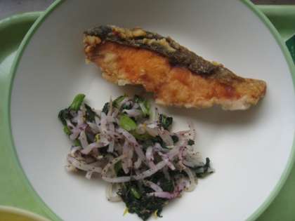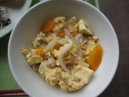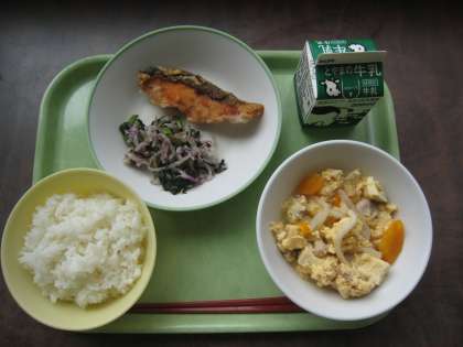親子煮の卵がふわっふわ! ごはん 牛乳 魚の竜田揚げ ゆかり和え 親子煮