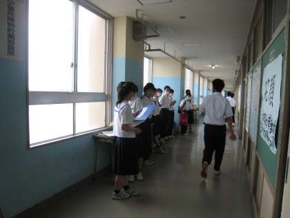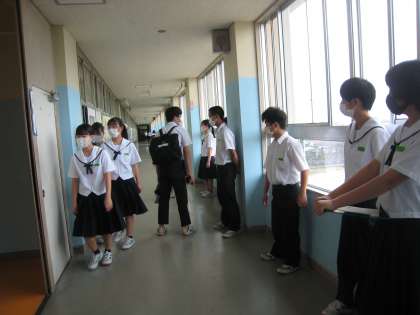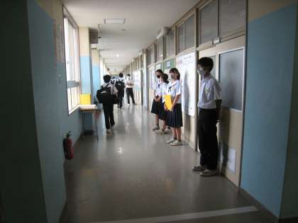 あいさつ運動 公開日 2021/07/09 更新日 2021/07/09 北中NEWS 生徒会執行部が企画している「挨拶強化期間」の班対抗あいさつ運動の最終日です。今日は各クラスの6班を中心に挨拶をしました。 雨なので、学年棟で行いました。