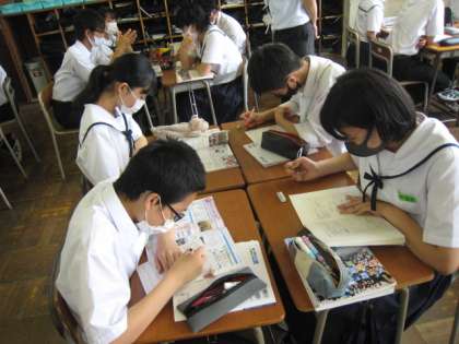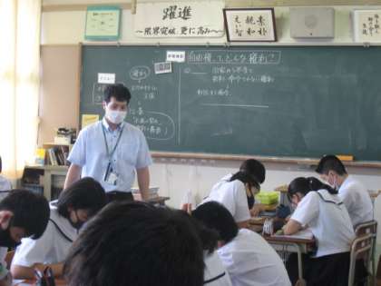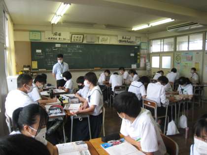 社会(公民)の授業です。 自由権について、グループ学習で学んでいます。