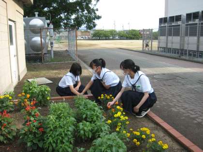 元気な挨拶で一週間が始まりました。 ボランティアのおかげで、花壇の花も元気です!