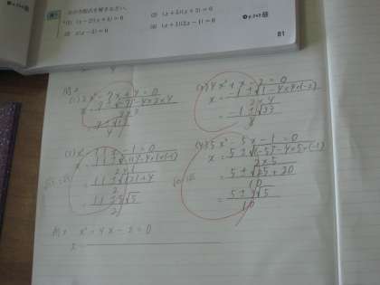数学の授業です。 解の公式を利用して、2次方程式を解いています。 全問正解!