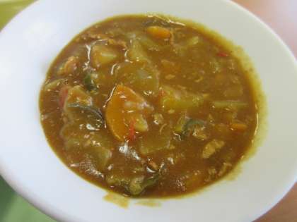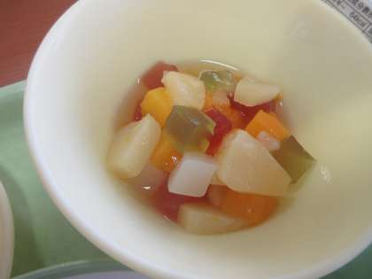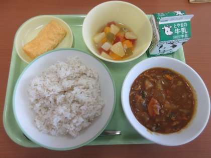 大人気メニュー「夏野菜カレー」 「大盛りでお願いしま〜す!!」 麦ごはん 牛乳 夏野菜カレー 卵ロール フルーツカクテル