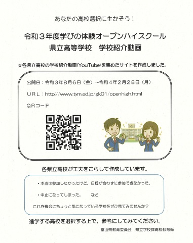 県立高校のオープンハイスクールが中止となりましたが、下記webサイトに各校の紹介動画が掲載されています。ご活用ください。