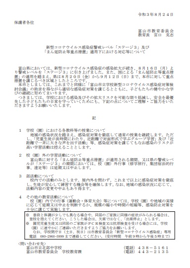 なお、文書は、始業式の8月27日(金)にお子様を通じて、各ご家庭に配付いたします。