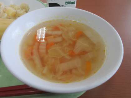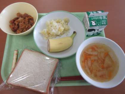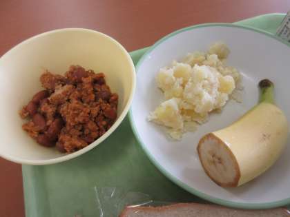 今日から給食が始まりました。残さずに食べましょう!! 食パン 牛乳 チリコンカン こふきいも 野菜スープ 棒チーズ バナナ