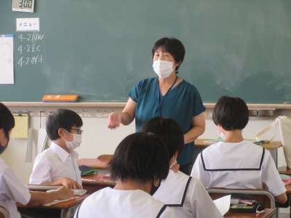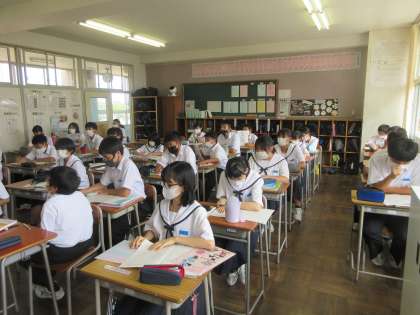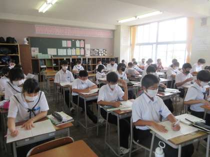 英語の授業です。 夏休みの課題「英単語めきめきトレーニング」を確認しました。