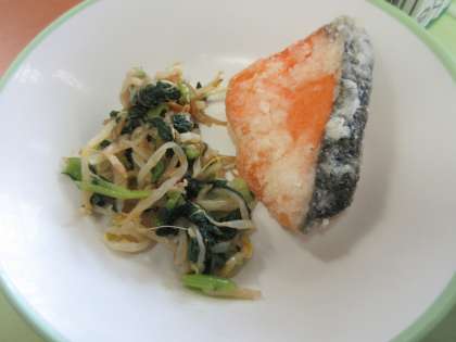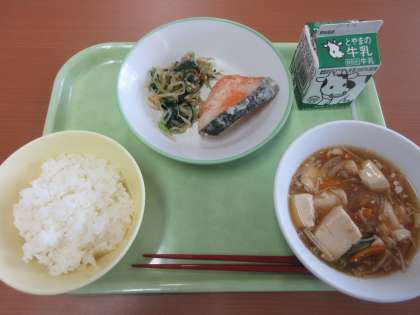 今日の給食 公開日 2021/09/09 更新日 2021/09/09 給食 「鮭のから揚げ」塩味がきいていて、皮までかりかり!! ごはん 牛乳 鮭のから揚げ 小松菜ともやしの香味和え 豆腐の野菜あんかけ