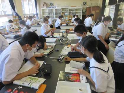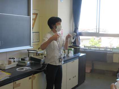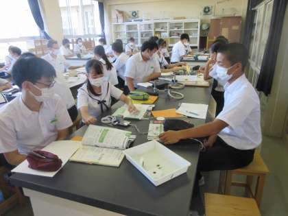 理科の授業です。 記録タイマーを使って、水平面上を一直線に移動する台車の運動を学習しました。