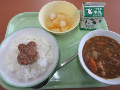 今日の給食 公開日 2021/09/14 更新日 2021/09/14 給食 カレーライスにウサギ型ハンバーグ、そして白玉と季節感たっぷり!! ごはん 牛乳 十五夜ハンバーグカレーライス ウサギ型ハンバーグ フルーツ白玉
