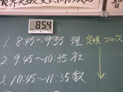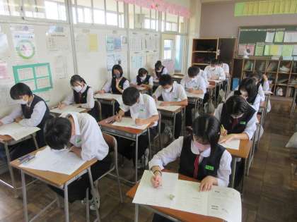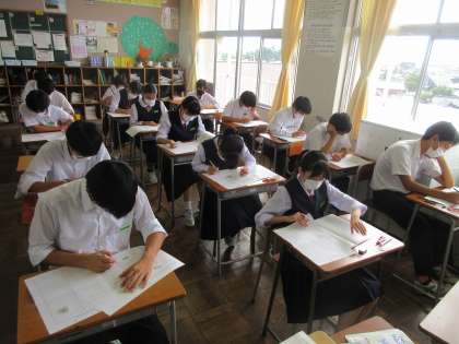 3年生は、1〜3限まで、第3回確認テストです。 今日は、理科、社会、数学のテストです。