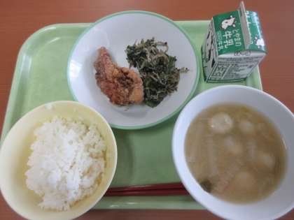 つみれ汁は、野菜たっぷりで、栄養たっぷり!! ごはん 牛乳 豚肉の香り揚げ よごし つみれ汁