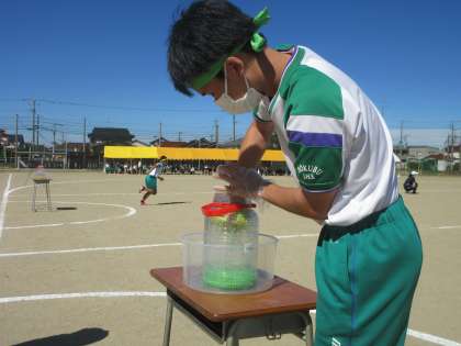 第75回体育大会(その22) 公開日 2021/09/30 更新日 2021/09/30 北中NEWS 2年生の学年種目です。 「目指せ!ZOUKING」です。どの団が一番多くの水を、雑巾を使って運べるでしょうか!!