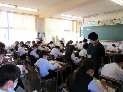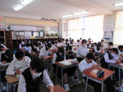 英語の授業です。 明日からの2学期中間評価に向けて、リスニングのトレーニングです。