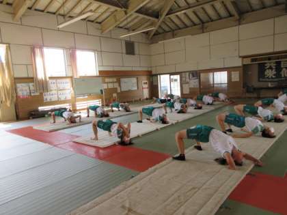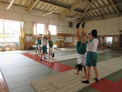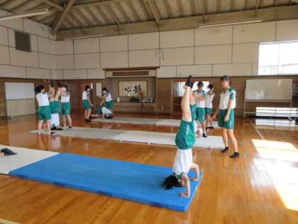 体育の授業です。 マット運動に取り組んでいます。