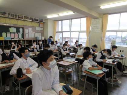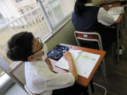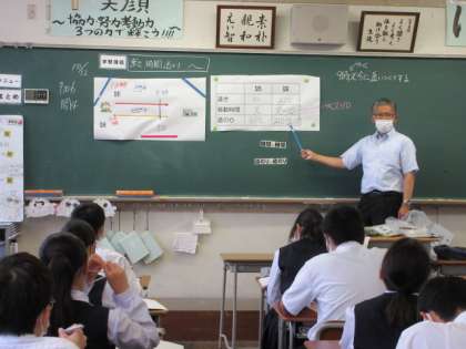数学の授業です。 これまで学習してきた方程式を、速さと時間と道のりの関係に応用しています。
