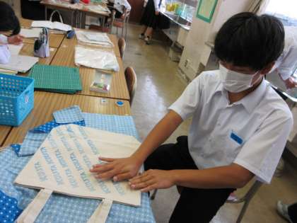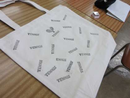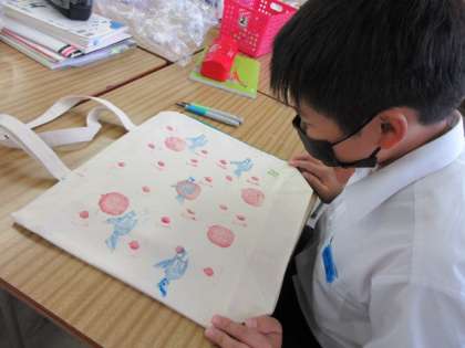 美術の授業です。 消しゴムはんこを作成し、トートバッグに押印しながら、作品を自分のイメージに近付けていきます。