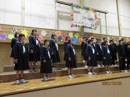 合唱コンクール(1年生)その4 公開日 2021/10/23 更新日 2021/10/23 第1学年 男女のバランスが整っています。 ソプラノとアルトのハーモニーが美しく、歌詞のすばらしさが伝わってきます。 「♪ま〜っすぐ、ま〜っすぐ!!♪」