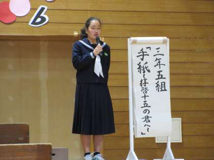 3年生のトップバッターは、3−5「手紙〜拝啓十五の君へ〜」です。