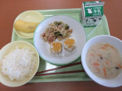 今日の給食 公開日 2021/10/28 更新日 2021/10/28 給食 切り干し大根ですが、味は、ペペロンチーノ!! ごはん 牛乳 にんじんシューマイ 切り干し大根のペペロンチーノ 豆乳みそスープ バナナ