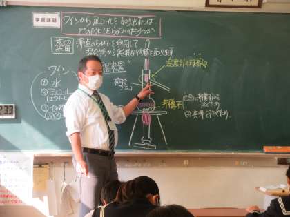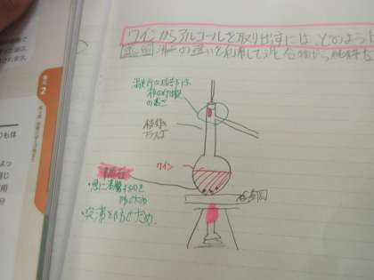 理科の授業です。 ワインからアルコールを取り出す方法を考えました。
