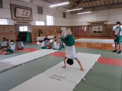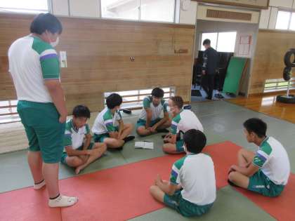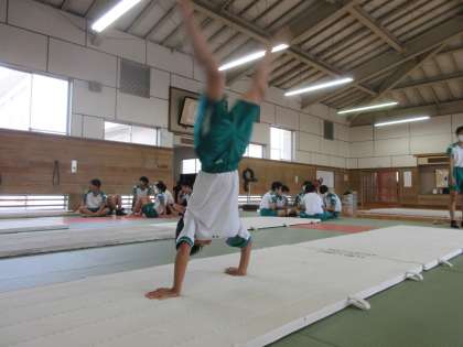 マット運動をグループで発表します。相談中です。 「どんな技を組みあわせる!?」