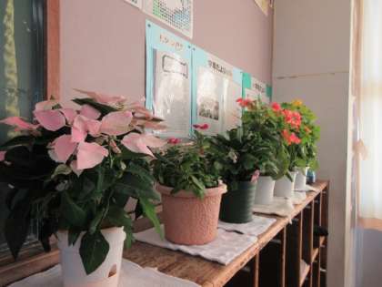英語の問題に取り組む生徒の背中を、花々が見つめます。