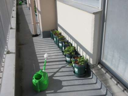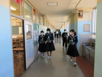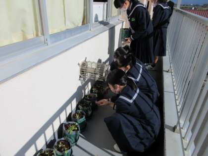 技術・家庭科の授業です。 技術室で芽を出した、鉢植えを教室横のベランダに移動しました。 陽当たりのよい場所で、育てます。