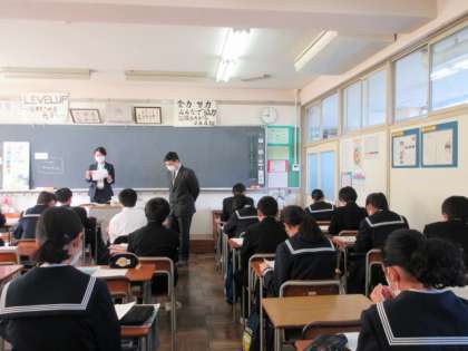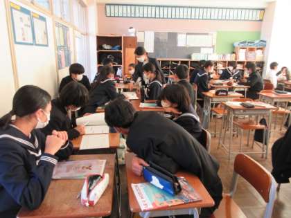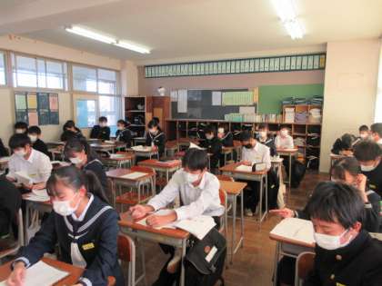 英語の授業です。 前半は学力調査の解説を聞き、後半は班の友達と協力しながら、ALTの先生からの課題に取り組みました。