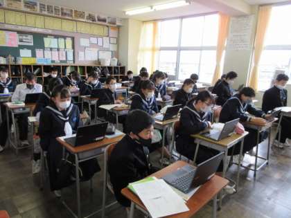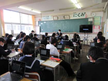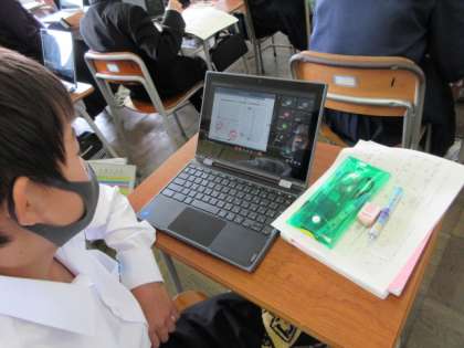 理科の授業です。 物体から出て、鏡で反射し、目に届く、光の通り道の作図について学んでいます。