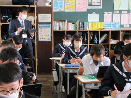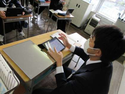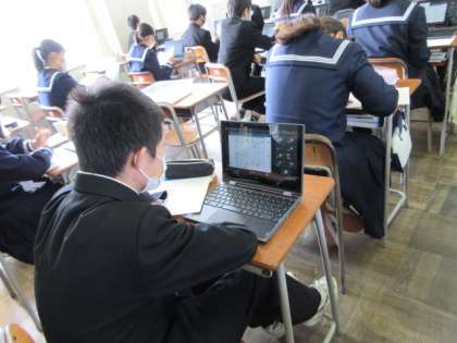 1−2(その2) 公開日 2021/11/10 更新日 2021/11/10 第1学年 光の通り道の作図の学習では、Chromebookを活用しています。 GoogleのMeet機能を利用し、コンピュータの画面を通して、作図する教師の手元の様子が、生徒のそれぞれの端末に表示されます。