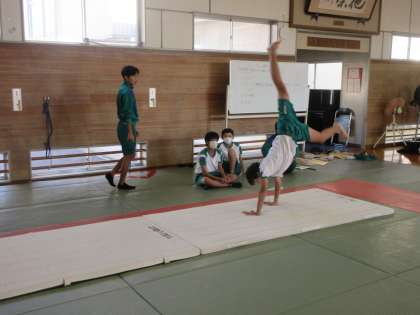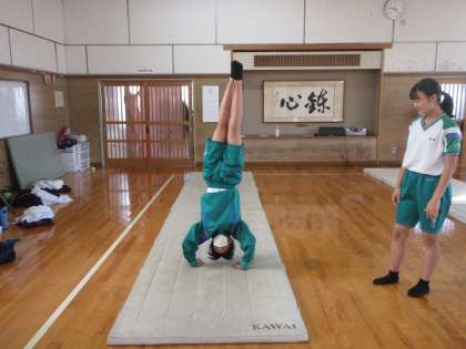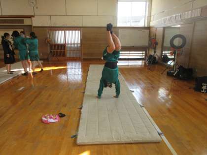 保健体育の授業です。 マット運動のテストです。大技にチャレンジ!!