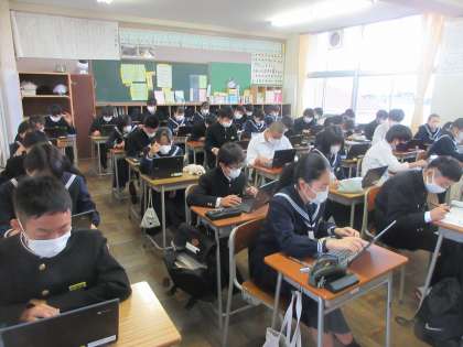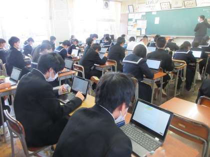 理科の授業です。 クロムブックを使って、小テストです。