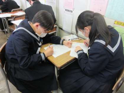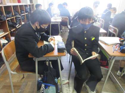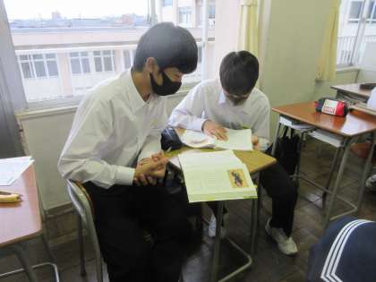 国語の授業です。 古典の暗唱テストです。互いに聞き合っています。