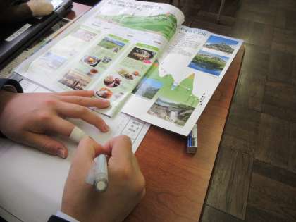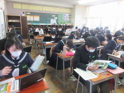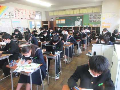 国語の授業です。 修学旅行の新聞づくりです。