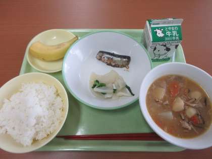 寒い時期は、煮物がしみます。 ごはん 牛乳 いわしの梅煮 ゆず和え 豚肉の南蛮煮 バナナ