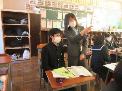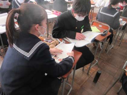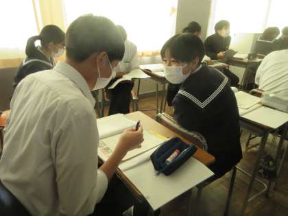英語の授業です。 thatやwhichを使ってものを紹介する文を学習しました。 ペアになって例文を練習します。