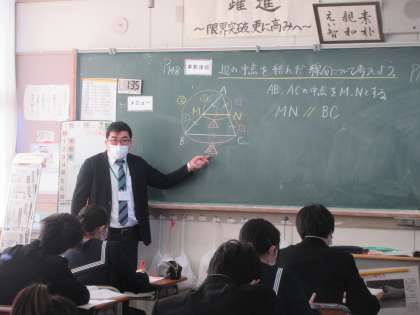 数学の授業です。 中点連結定理の学習です。