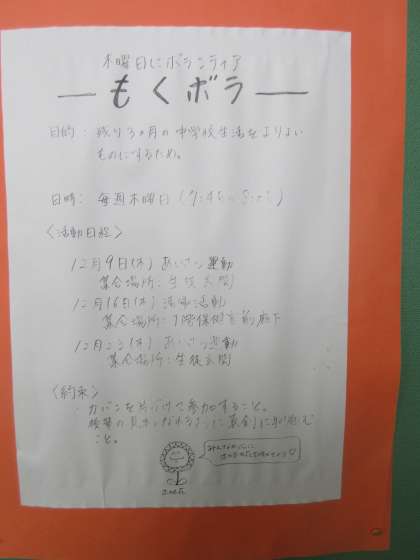 学年生徒会活動(3年生) 公開日 2021/12/08 更新日 2021/12/08 第3学年 「もくボラ」 毎週木曜日に、ボランティア活動を行います。 早速明日からです。明日は、テストですが、頑張って参加して、頭をすっきりさせましょう!!