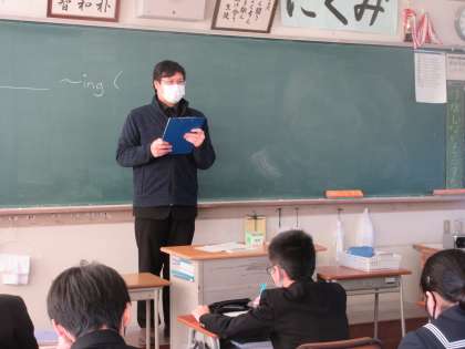 英語の授業です。 ALTのレイ先生と、リスニングクイズをしました。