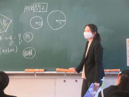 数学の授業です。 相似な図形の面積比や体積比を求めました。