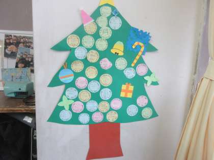 クリスマスツリーに、「こんなクラスにしたい」や「欲しいもの」の願いを書きました。