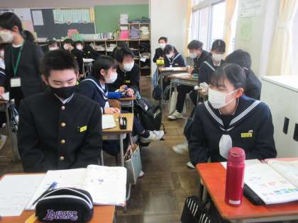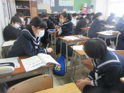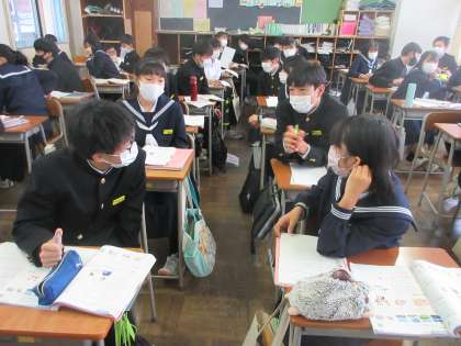 2−4(その2) 公開日 2021/12/13 更新日 2021/12/13 第2学年 「Which is more difficult ,English or math?」 「English is more difficult than math.」 ペアになって練習しました。